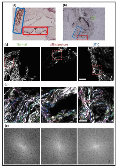 Workflow for identifying p53 and STIC precursors. A pathologist defined these tissues in mutant p53 stained images ((a), 4×), where green, red, and blue correspond to normal regions, p53, and STIC, respectively. The correlated unstained regions ((b), 4×) were identified and then used for SHG imaging, where the corresponding images are shown in (c) (field size = 180 × 180 microns). (d,e) CT-FIRE overlays and 2D-FFT power spectra of the cropped SHG images (red-dashed boxes) are shown.