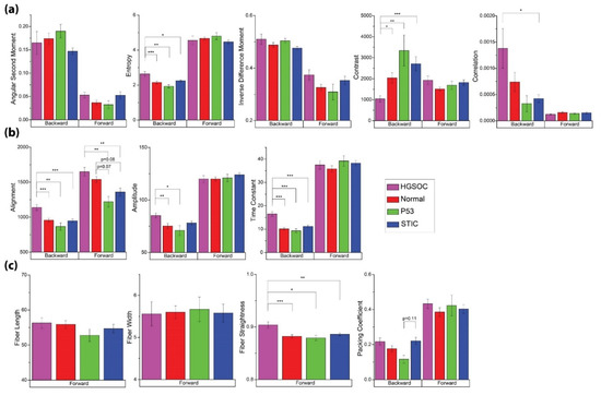 2D-FFT methods were able to distinguish HGSOC as having higher alignment in the forward and backward channels, where both readouts of this metric should trend in the same direction. There was also a greater relative occurrence of high frequency (smaller) features in HGSOC, which is indicated by the higher time constant in its radial power spectrum (Figure 4b). Conversely, the STIC and p53 signature groups were characterized by lower alignment in the forward channel, although this was not significantly different. Lastly, while HGSOC was associated with straighter fibers, no differences were found between the two precursors and normal (Figure 4c).