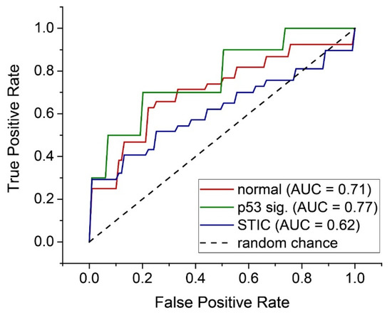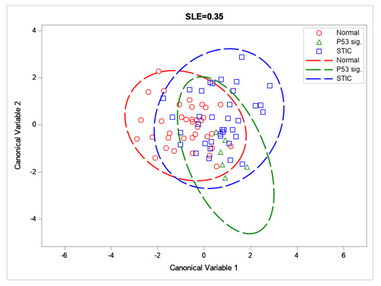 The SAS software (SAS Institute Inc., Cary, NC, USA) was used to reduce the full feature set to the most significant metrics via forward selection at a significance level of α = 0.35 (STEPDISC procedure). After the features were selected, the truncated dataset was inputted to a linear discriminant analysis (LDA) performed with singular value decomposition and N-weighted priors. For this portion, 37 crops as normal, 6 as p53 signatures, and 37 as STIC were analyzed.