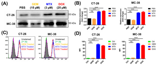 The anticancer agents MTX and DOX are known to cause the translocation of CRT to the plasma membrane during the pre-apoptotic stage (ecto-CRT) and to induce ICD [8]. By contrast, GEM does not induce ecto-CRT during the pre-apoptotic stage even though it induces cell death. To evaluate ecto-CRT on the plasma membrane during pre-apoptosis, CT-26 and MC-38 cells were treated with these anticancer agents for 4 h (Figure 1). Through Western blot analysis of CT-26 plasma membrane fractions, after MTX and DOX treatment, ecto-CRT was significantly increased (2.04-fold and 2.14-fold, respectively) compared with non-treated controls (Figure 1A,B). In MC-38 cells as well, ecto-CRT significantly increased after MTX and DOX treatment (2.25-fold and 2.39-fold, respectively), compared with non-treated controls. However, the ecto-CRT level did not increase during pre-apoptosis in GEM-treated cells. This result was similar by flow cytometry analysis (Figure 1C,D) and by confocal immunofluorescence imaging (Figure S2). Moreover, DOX and MTX significantly increased the expression of ecto-CRT in HeLa and MDA-MB-231 cells (Figure S1). These data indicate that DOX and MTX induced ecto-CRT exposure on the plasma membrane in the early (pre-apoptotic) phase of ICD.