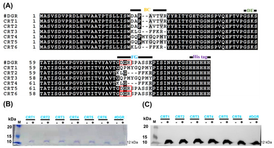 Two peptides (Int-α and Hep-I) have been described to bind CRT [45,60,61]. Three loop sequences (BC, DE, and FG) of monobodies are responsible for target binding, and two of the loops (BC and FG) have a much longer length [62]. Therefore, we replaced the wild-type sequences with the Int-α and Hep-I peptide sequences at these loops. The engineered monobodies were named CRT1–CRT6. It should be noted that the RGD sequence at the FG loop was changed to DGR (a scrambled sequence of RGD) because this motif is responsible for integrin binding [63]. In this study, wild-type FN3 with a DGR sequence (named #DGR) was used instead of RGD as a negative control monobody. The amino acid sequences of all monobodies were clearly aligned, as shown in Figure 2A.