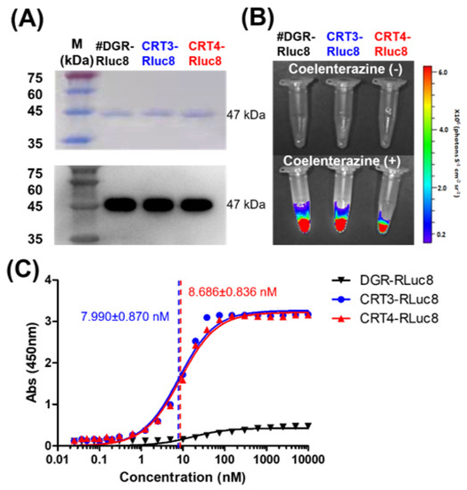 3.3. Characterization of Rluc8-Fused CRT-Binding Monobodies