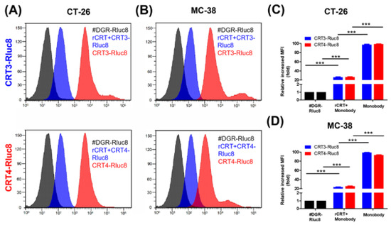 Monobodies specifically bound to ecto-CRT of cancer cells undergoing ICD. Cancer cells were treated with DOX and recombinant CRT (rCRT), and stained with Rluc8-fused monobodies. After washing, the cells were analyzed for monobody binding by flow cytometry. (A) Flow cytometry of CT-26 cells with exposed ecto-CRT mixed with rCRT. (B) Flow cytometry of MC-38 with exposed ecto-CRT mixed with rCRT. (C,D) Quantitation of (A) and (B). MFI levels of the monobodies bound to ecto-CRT were calculated relative to #DGR-Rluc8. Data are shown as the mean ± standard error (n = 3). *** p < 0.001.