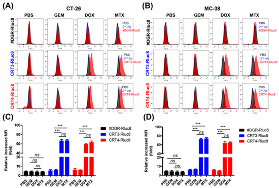 Rluc8-fused monobodies efficiently bound cancer cells with exposed ecto-CRT. Cancer cells (CT-26 and MC-38) were treated with anticancer agents (DOX, MTX, or GEM) for 4 h. Then, cells were stained with monobodies and analyzed by flow cytometry. (A,C) Flow cytometry of CT-26 cells. (B,D) Flow cytometry of MC-38 cells. PBS as negative control. Second Ab is used as control of the background fluorescence signals. The increase in MFI is shown relative to the respective control groups. Data show the mean ± standard error (n = 3). *** p < 0.001, and ns = non-significant.