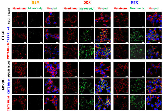 To verify that the Rluc8-fused monobodies specifically recognize ecto-CRT, competitive binding analysis of the monobodies was performed by flow cytometry using cells treated with anticancer agents and rCRT (Figure 4). In CT-26 and MC-38 cells treated with DOX, the MFI levels of the monobodies decreased about 73% in the presence of rCRT. FN3(DGR)-Rluc8 (#DGR-Rluc8) was used as a negative control for this experiment. Similar results were observed in HeLa and MDA-MB-231 cells (Figure S4). In addition, immunofluorescence imaging analysis of anticancer drug–treated cells was performed using an anti-CRT antibody and Rluc8-fused monobodies against ecto-CRT. As shown in Figure S2, MTX and DOX but not GEM and PBS expressed ecto-CRT on the cell surface during ICD. As expected, CRT3-Rluc8 and CRT4-Rluc8 monobodies efficiently bound to CT-26 and MC38 cells treated with DOX and MTX, but not GEM, by both flow cytometry and immunofluorescence imaging analyses (Figure 5 and Figure 6). Similar results were observed in HeLa and MDA-MB-231 cells treated with MTX and DOX (Figures S5 and S6). This clearly indicates that the CRT3 and CRT4 monobodies bind with high affinity to ecto-CRT expressed on cancer cells undergoing ICD [10,14,69].