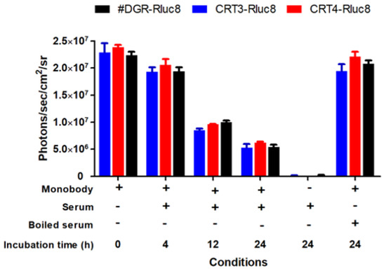 To assess the efficacy of Rluc8-fused monobodies as in vivo imaging candidates, the stability of the monobodies was first measured in mouse serum after incubation at 37 °C (Figure 7). CRT3-Rluc8, CRT4-Rluc8, and #DGR-Rluc8 showed similar photon counts at each time-point, with a maximum value of 2.3 × 107 photons/sec/cm2/sr. Their luciferase activities decreased to approximately 40% of the control after 12 h and to 24% after 24 h. This stability data is similar to that of other Rluc8-fused monobodies in mouse serum [52].