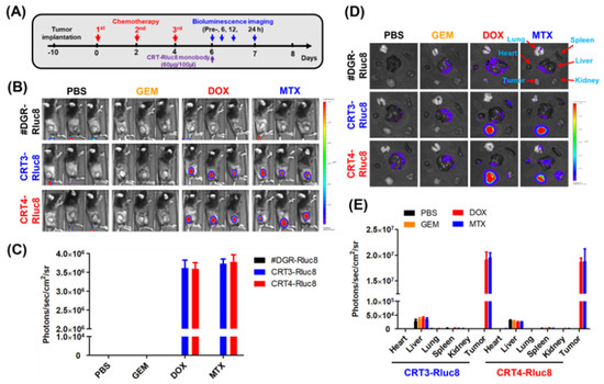 Finally, the targeting potential of the monobodies as in vivo diagnostic agents for the detection of ICD during chemotherapy was assessed. To do this, CRT3-Rluc8 and CRT4-Rluc8 (60 ug per mouse) were injected via the tail vein into MC-38 tumor-bearing mice pre-treated with anticancer agents (Figure 8). The bioluminescence signals from the injected monobodies were measured for 24 h (Figure 8A). The #DGR-Rluc8-injected groups did not show any bioluminescence signal in mice receiving any anticancer treatment. By contrast, significant signals were detected at 6 h, peaked at 12 h, and disappeared at 24 h in mice treated with DOX or MTX, but not GEM, after the injection of CRT3-Rluc8 or CRT4-Rluc8 (Figure 8B,C; Figure S9). Next, we measured the monobody biodistribution in mouse tissues at 12 h after the monobody injection (Figure 8D,E). The bioluminescence signals from Rluc8-fused monobodies were measured in dissected organs using the IVIS imaging system. Strong signals were observed in the tumors of mice treated with DOX and MTX but not GEM after monobody injection. The signal in #DGR-Rluc8-injected tumors was below the limit of detection. Similar results were obtained in CT-26 tumor-bearing mice (Figure S10). These results clearly indicate that the engineered CRT3 and CRT4 monobodies specifically bound to ecto-CRT during ICD. These monobodies can therefore be considered potential theranostic imaging candidates for the early detection of ICD during anticancer agents’ treatment.