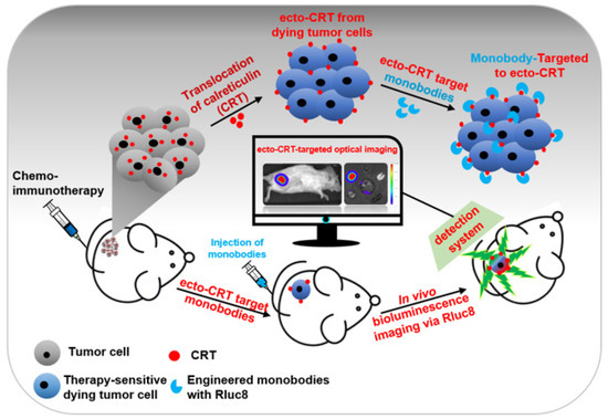 Schematic representation of the early detection of immunogenic cell death (ICD) in cultured tumor cells and mouse models. After anticancer drug treatment, calreticulin (CRT) translocate from the endoplasmic reticulum to the plasma membrane of tumor cells (ecto-CRT). Ecto-CRT is detected with the injected Rluc8-fused CRT monobodies, and the target binding is assessed using a bioluminescence imaging system. The luminescent signal represents ICD after chemotherapy.