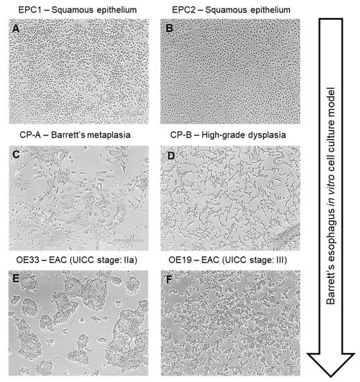 The Barrett’s in vitro cell culture model consistent of the two squamous epithelium cell lines EPC1 (A) and EPC2 (B), the metaplastic cell line CP-A (C), the high-grade dysplastic cell line CP-B (D), and the two EAC cell lines OE33 (E) and OE19 (F).