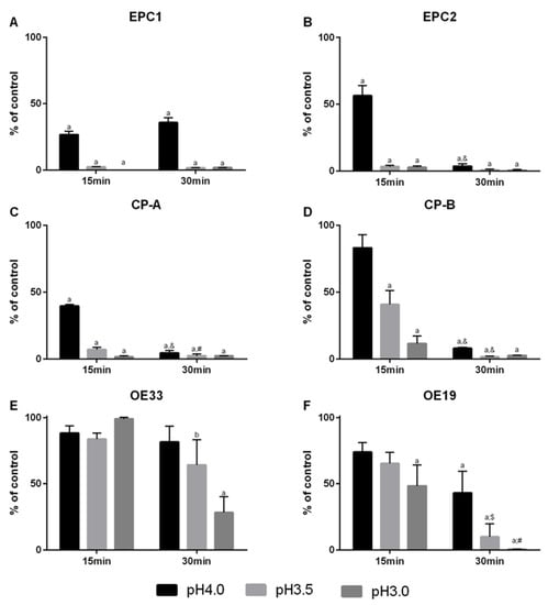 Acid susceptibility in a Barrett’s esophagus cell culture model. Esophageal squamous epithelium cell lines EPC1 (A), EPC2 (B); Barrett’s metaplasia cell line CP-A (C), Barrett’s high-grade dysplasia cell line CP-B (D), and esophageal adenocarcinoma cell lines OE33 (E) and OE19 (F) were exposed to acidified media with pH 4, pH 3.5, or pH 3 for 15 and 30 min. Full growth medium (pH 7.4) served as controls. Viability was measured photometrically by PrestoBlue Cell Viability Reagent stain. Values are shown as mean ± S.E.M. (Two-way ANOVA with Sidak’s multiple comparisons test; a—p < 0.001, b—p < 0.01 compared to control; &—p < 0.001, $—p < 0.01, #—p < 0.05, compared to 15 min).