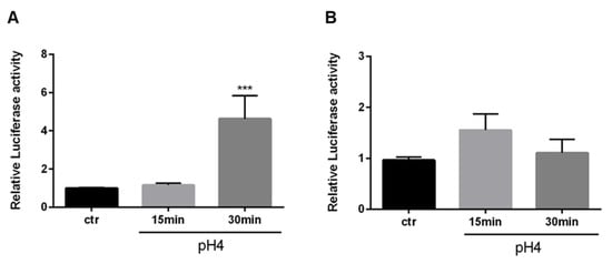Acidified medium induces Nrf2 activity in a cell line specific manner. OE33 (A) and OE19 (B) were treated with acidified medium (pH 4) for 15 and 30 min and were analyzed by luciferase assay. Values are shown as mean ± S.E.M. (Kruskal–Wallis test with Dunn’s multiple comparisons test; ***—p < 0.001, compared to untreated controls).