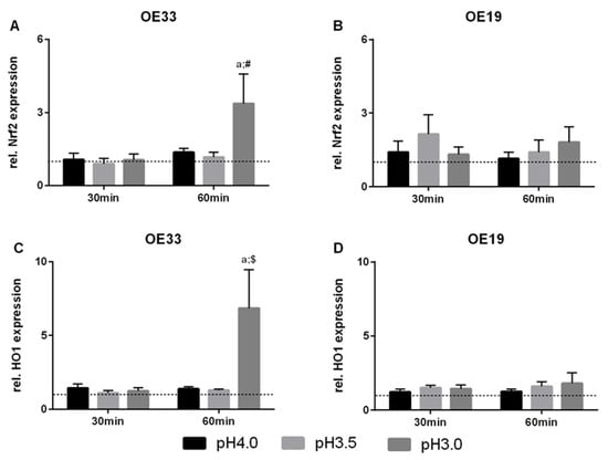 Furthermore, distinct expression of Nrf2 and HO1 were investigated. Nrf2 expression levels were significantly elevated (3.4-fold) in OE33 cells following exposure to pH 3.0 medium for 30 min (Figure 4A). OE19 cells did not show any change in Nrf2 expression levels (Figure 4B). In line with these results, OE33 cells displayed an increase in HO1 expression (6.9-fold), OE19 did not, compared to control cells (Figure 4C,D).