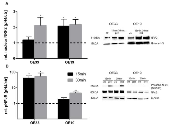 NRF2 and NFκB phosphorylation in EAC cells after acute acid exposure. Nuclear accumulation of NRF2 (A) and the phosphorylation of NFκB (B) were investigated. Both, nuclear NRF2 and NFκB phosphorylation were measured by Western blot. OE33 and OE19 cells were treated once with acidic medium (pH 4) for 15 and 30 min. A representative Western blot is shown for NRF2 and NFκB. Values are shown as mean ± S.E.M. (Kruskal–Wallis test with Dunn’s multiple comparisons test; **—p < 0.01, *—p < 0.05 compared to untreated controls).