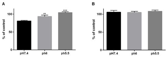 5-FU susceptibility against acidic pH. OE33 (A) and OE19 (B) cells were treated with 10 µM, respectively, 5-FU at pH 7.4 (neutral) or in acidified medium at pH 6 and pH 5.5 for 24 h. Values are shown as mean ± S.E.M (One-way ANOVA with Holm–Sidak’s multiple comparisons test; ***—p < 0.001, **—p < 0.01 compared to controls).