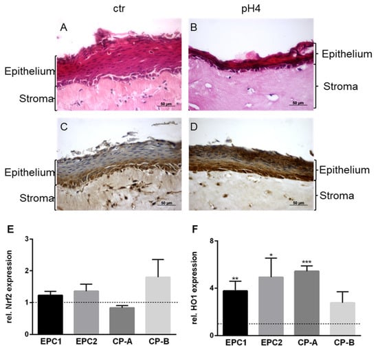 To investigate, whether Nrf2 and HO1 are affected in non malignant cells after chronically acid exposure, esophageal organotypic 3D-cultures (OTC) were carried out using EPC2 cells. Additionally, the mRNA expression of Nrf2 and HO1 were investigated in EPC1, EPC2, CP-A, and CP-B cells. EPC2 cells constitute a stratified squamous epithelium in a crosstalk with matrigel-embedded esophageal stromal fibroblasts (FEF3). To mimic acid reflux, the OTCs were treated with acidified medium (pH 4) from day 20–25. Acidic exposure led to shrinkage of the epithelial layer (Figure 7A,B). Expression levels of HO1 were analyzed by immunohistochemistry. HO1 immunohistochemistry demonstrated an increased presence of the enzyme in the pH 4-exposed samples (Figure 7C,D). Since transcription factor Nrf2 and its downstream target HO1 play an important role in inflammation and self-protection of cells against cellular stress, we determined their gene expression after repeated exposure to acidified medium. To mimic recurring reflux, EPC1, EPC2, CP-A, and CP-B were treated three times per day with pH 4 media for two consecutive days. While Nrf2 expression levels were not significantly altered in the four cell lines (Figure 7E), HO1 expression was 3.8-fold, 4.9-fold, 5.4-fold, and 2.8-fold increased in EPC1, EPC2, CP-A, and CP-B, respectively, compared to control cells (Figure 7F).