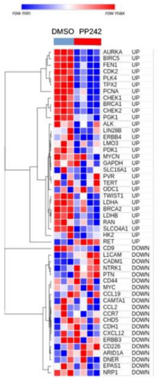 Because CMap does not include NB cell lines among those used to create the reference database, we needed to confirm the CMap findings in NB cells. To this aim, we performed a literature search to find the published gene expression profiles of NB cell lines cultured under hypoxia and treated with mTOR inhibitors. Mohlin and colleagues recently published a dataset, hereafter referred to as the Mohlin dataset, which was used to show the therapeutic efficacy of targeting PI3K and mTOR complex 2 (mTORC2) in aggressive NB cells [22]. In this study, SK-N-BE(2)c NB cells treated with the mTORC complex inhibitor, PP242, or dimethyl sulfoxide (DMSO), as a control, were cultured under hypoxic conditions for different time points, and the gene expression profile was determined by microarray analysis [22]. We extracted the gene expression profiles relative to the 24 h of hypoxia treatment from the Mohlin dataset, and used these data to assess the expression of the 34 up- and 21 down-regulated genes analyzed with CMap. CDK1, PKM, PROM1, SRCIN1, and TP53, which we found to be modulated by hypoxia in primary NB tumors [8], were absent in the Mohlin dataset and were, thus, excluded from subsequent analyses (Table S3). A heatmap of those genes found present in the Mohlin dataset revealed that all genes that we had identified as being up-regulated in hypoxic NB tumors [8] are down-regulated after PP242 treatment in the SK-N-BE(2)c NB cell line cultured under hypoxic conditions for 24 h. The inverse behavior was observed for downregulated genes, thereby corroborating the negative connectivity between mTOR inhibitors and hypoxia in NB cells (Figure 5).