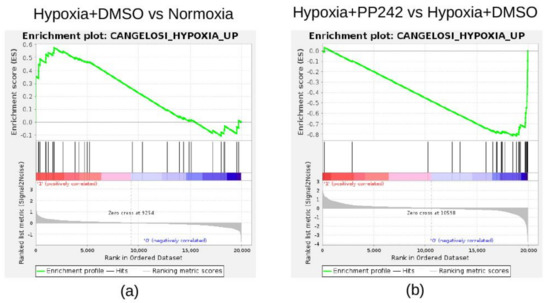 Enrichment plots for custom gene sets found significantly enriched in two distinct gene set enrichment analysis (GSEA) experiments. The plots report the significant enrichment of the CANGELOSI_HYPOXIA_UP gene set in SK-N-BE(2)c cells cultured under hypoxia (a) or with mTORC complex inhibitor PP242 (b). The experimental groups used to perform GSEA are reported on top of the plots. The enrichment plot shows the gene set name (top), the running enrichment score (green curve), the positions of the gene set hits on the rank ordered list in GSEA (black bars), and the rank ordered list according to the signal-to-noise metric (bottom). Red indicates the highest signal-to-noise values, whereas blue indicates the lowest ones.