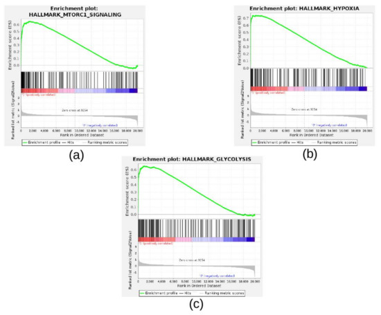 Interestingly, among the significantly enriched gene sets of GSEA, we found HALLMARK_MTORC1_SIGNALING, HALLMARK_HYPOXIA, and HALLMARK_GLYCOLYSIS (Table 2). The GSEA enrichment plots of these gene sets highlighted a clear up-regulation of genes involved in the cellular response to hypoxia and MTORC1 signaling in NB cells cultured under hypoxia (Figure 7A–C).