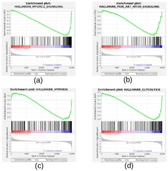 Enrichment plots for selected hallmark gene sets found negatively enriched in NB cells treated with mTORC complex inhibitor PP242. Selected enrichment plots from GSEA. The enrichment plot shows the gene set name (top), the running enrichment score (green curve), the positions of the gene set hits on the rank ordered list in GSEA (black bars), the rank ordered list according to the signal-to-noise metric (bottom). Red indicates the highest signal-to-noise values, whereas blue indicates the lowest ones. Plots are relative to: (a) HALLMARK_MTORC1_SIGNALING, (b) HALLMARK_PI3K_AKT_MTOR_SIGNALING, (c) HALLMARK_HYPOXIA, and (d) HALLMARK_GLYCOLYSIS.