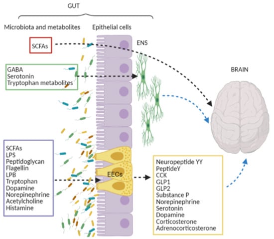 Certainly, molecules that play an important role in the gut-brain crosstalk are the hormones secreted by the EECs whose release is also influenced by the diversity and composition of gut bacteria [41]. It has been shown that bacterial metabolites, such as lipopolysaccharide (LPS), SCFAs, and tryptophan, stimulate the EECs of the gut epithelium to produce neuropeptides, including peptide YY, neuropeptide Y, cholecystokinin, glucagon-like peptide (GLP)-1 and 2, and substance P. These neuropeptides cross the lamina propria, move along the bloodstream and reach local receptors, affecting ENS neurons and/or extrinsic vagal innervation [42,43]. The gut microbiota may also modulate the production of neurotransmitters and neuromodulators. It has been reported that the levels of norepinephrine, serotonin, and dopamine were decreased in GF mice, while those of GLP-1, corticosterone, and adrenocorticosterone were increased [44], suggesting that gut microbiota is able to promote the release of gut hormones from the EECs through metabolites or bacterial components [45,46,47,48].
