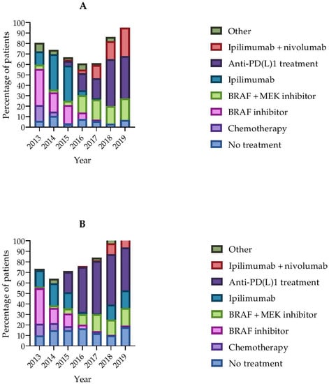 First-line treatments changed over time in both age groups (Figure 1). While, in 2013, the majority of patients were treated with a BRAF inhibitor or chemotherapy, after 2017, most patients were treated with anti-PD1 monotherapy as first-line treatment.