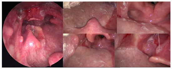 Nasofibroscopic views of a 60-year-old patient with a T3N0 hyalinizing clear-cell carcinoma of the tongue base. He underwent transoral robotic surgery and reconstruction with an anterolateral thigh free flap and did not require postoperative radiotherapy. Fourteen months after the surgery, he had a normal oral diet and speech and a very satisfactory quality of life.