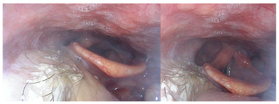 Of the 46 patients who were tracheotomized at the time of surgery, excluding the two patients who died postoperatively, 100% were successfully decannulated in a median time of 12.5 days (range, 4–372), although the patient who had a postoperative stroke and a patient with chronic pulmonary aspergillosis needed a further recannulation for recurrent aspiration and for chronic respiratory insufficiency, respectively. The median time before being able to start at least partial oral alimentation was 17 days (range, 8–840). All of the patients began swallowing rehabilitation with a speech therapist during their hospitalization, and they continued with outpatient re-education. The mean length of hospitalization was 25 days (range, 10–52). All of the patients who were deemed to be candidates for postoperative radiotherapy (n = 15) or reirradiation (n = 11) were able to undergo the required treatment within six weeks postoperatively. The median follow-up time was 15 months. The rate of at least partial persistent enteral feeding at the last follow-up was 30.2% and this was higher with salvage surgery and surgery for a second primary cancer (35.3% and 33.3%, respectively) than with surgery for a first localization (23.5%). Posterior pharyngeal wall localizations were at high risk of persistent enteral tube feeding (62.5%) compared to tongue base (35%), tonsillar fossa (8.3%), and soft palate (0%) localizations. Highly critical key elements for efficient oral alimentation were the restoration of the tongue base volume, the preservation of laryngeal ascension at swallowing in case of a history of radiotherapy, the lateral unfolding of the sinus piriform at swallowing due to the preservation of the topography of the lateral pharyngoepiglottic fold, and the preservation of the sensitivity of the junction between the oropharyngeal and the hypopharyngeal posterior wall (Figure 2 and Figure 3).