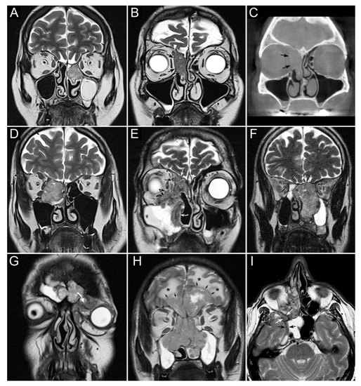 Panel summarizing several patterns of local extension of nasoethmoidal squamous cell carcinoma (SCC) and other epithelial cancers. (A) Left nasoethmoidal SCC with neuroendocrine features, limited to the nasoethmoidal compartment. (B,C) Non-keratinizing SCC of the right nasoethmoidal compartment determining resorption of the lamina papyracea (arrows in C), with no frank transgression of the periorbit. A T2-hypointense line is visible between the tumor and extraconal fat (arrows in B). The supraorbital ethmoidal recess is filled by dehydrated secretions (arrowhead in B). (D) Orbit-encroaching right nasoethmoidal SMARCB1/INI1-deficient carcinoma. A T2-hypointense line separating the tumor from the extraconal fat cannot be clearly demonstrated. (E) Right nasoethmoidal poorly differentiated SCC invading the extraconal fat (black arrows), anterior skull base (white arrow), and medial maxillary wall (curved white arrow). (F) Left nasoethmoidal adenosquamous carcinoma determining cranial displacement of the T2-hypointense thin layer made up by the ethmoidal-sphenoidal roof and overlying dura mater (white arrows). (G) Left nasoethmoidal SMARCB1/INI1-deficient carcinoma involving both frontal sinuses and invading the orbital cavity through the floor of the left frontal sinus (curved arrow). (H) Non-intestinal-type adenocarcinoma of the nasoethmoidal box with massive transcranial extension (arrows). Brain edema (asterisks) suggests invasion of the cerebral parenchyma. (I) Poorly differentiated SCC of the right nasoethmoidal compartment, with involvement of the inferior orbital fissure (white arrows) and macroscopic perineural extension along a thickened maxillary nerve to reach the Meckel’s cave (black arrows).