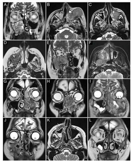 Panel summarizing several patterns of local extension of maxillary squamous cell carcinoma (SCC) and other epithelial cancers. (A) SCC ex inverted papilloma limited to the right maxillary sinus. A quite regular striated appearance indicates the papilloma (dotted curved lines). (B) Poorly differentiated SCC of the left maxillary sinus with massive infiltration of premaxillary tissues. (C) Spindle-cell SCC of the left maxillary sinus with initial infiltration of the fat pad located within the infratemporal fossa (arrows). (D) Moderately differentiated SCC of the right maxillary sinus with massive infiltration of the infratemporal fossa (arrows). (E) Neuroendocrine carcinoma of the right maxillary sinus infiltrating the ipsilateral nasoethmoidal compartment and alveolar process (white arrows), and massively invading the infratemporal and temporal fossae (black arrows). (F) Poorly differentiated SCC of the right maxillary sinus invading the infratemporal fossa, medial and lateral pterygoid muscle, and the upper parapharyngeal space (arrows). (G) Poorly differentiated SCC of the left maxillary sinus with initial orbital encroachment; the T2-hypointense line separating the tumor from the extraconal fat is partially interrupted, suggesting initial invasion of the extraconal compartment (arrows). (H) Moderately differentiated, keratinizing SCC of the left maxillary sinus with orbital involvement; a T2-hypointense line separating the tumor from the extraconal fat cannot be depicted (arrows). (I) Poorly differentiated SCC of the left maxillary sinus with massive invasion of the extraconal fat (arrows). (J–L) Three examples of SCC of the maxillary sinus with permeative bone invasion, which consists of cancer progressing within bone structures while partially maintaining their initial shape (arrows).