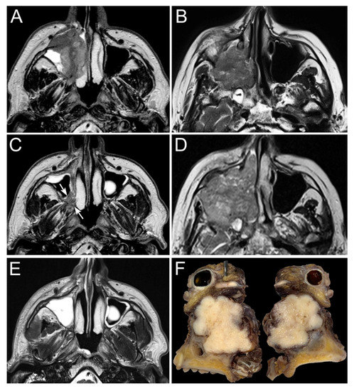 The panel shows two examples of locally advanced poorly differentiated squamous cell carcinoma of the right maxillary sinus (A,B). Both patients underwent neoadjuvant chemotherapy (3 cycles) with taxane, cisplatin, and 5-fluorouracile, which resulted in a heterogenous response: the first tumor (C) showed a partial response (arrows), whereas the second one (D) progressed throughout chemotherapy. Based on the response to chemotherapy, the first patient was treated through intensity-modulated proton therapy combined with concomitant platinum-based chemotherapy, which led to a complete response with no relevant toxicity (E). The second patient was instead operated on through a total maxillectomy extended to the infratemporal fossa and upper parapharyngeal space, orbital exenteration (F), anterior and middle craniectomy with dural resection, skull base multilayer graft-based reconstruction, and anterolateral thigh free flap.