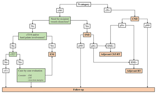 Flowchart summarizing the neck management strategy proposed based on available literature and authors’ experience. CND, comprehensive neck dissection; ChT, chemotherapy; ENE, extranodal extension; ENI, elective neck irradiation; LVI, lymphovascular invasion; N, nodal; PNI, perineural invasion; RT, radiotherapy; SND, selective neck dissection.