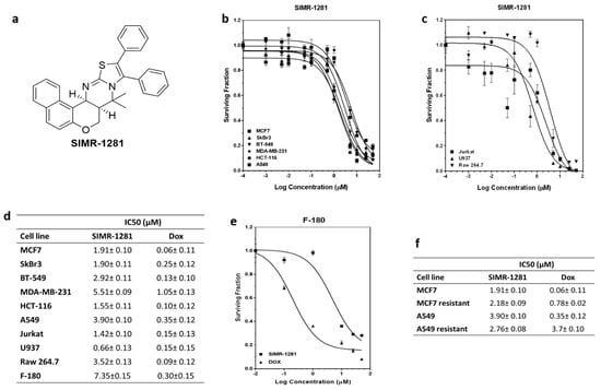 The antiproliferative effect of SIMR1281 on a panel of cancer cell lines and normal fibroblast cells (F-180). (a) Chemical structure of SIMR1281. (b,c) Dose-dependent effect of SIMR1281 on the indicated cell lines. (d) The IC50s of SIMR1281 in cancer cell lines and in normal F-180 cells, Data are mean ± SEM (n = 3). (e) Surviving fraction of SIMR1281 and doxorubicin-treated F-180 cells. (f) The IC50 of SIMR1281 in MCF7 and A549 cancer cell lines that acquired resistance to cancer medications, data are mean ± SEM (n = 3).