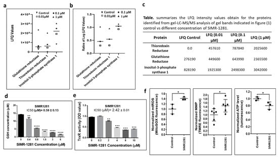 SIMR1281 targets the function of key proteins and modulates mitochondrial functions. (a) the LFQ ratios of cell lysate treated with different concentrations as indicated. (b) The ratios (treatment/control) of transformed LFQ values. (c) A table summarizes the LFQ intensity values for the identified proteins. (d,e) The effect of SIMR1281 on the concentration of oxidized glutathione (GSH) and thioredoxin reductase activity. Columns are mean ± SD (n = 3). (f) Cellular redox potential, MMP, and ATP level upon the treatment with SIMR1281. p-value determined by two-tailed unpaired t-test. * indicates significant difference versus control at p < 0.05 (*), p < 0.01 (**), p < 0.001 (***), p < 0.0001 (****).