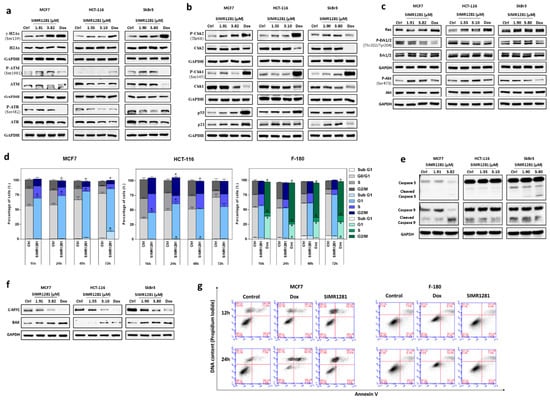 SIMR1281 possesses a potent pleiotropic anticancer effect. (a–c) Western blot analysis of the expression levels of the indicated proteins following treatment with SIMR1281 in MCF7, HCT-116, and SkBr3 cells (n = 3). (d) Cell cycle arresting potentials of SIMR1281 in the treated MCF7, HCT-116 and F-180 cells (n = 3). * Indicates significant difference versus control at p < 0.05 (*) by two-tailed unpaired t-test. (e,f) Immunoblots of the indicated proteins following treatment with SIMR1281 in MCF7, HCT-116, and SkBr3 cells (n = 3). (g) Annexin V/PI staining of MCF7 and F-180 cells after treatment with Dox and SIMR1281 (n = 3). Full Western blots are available in Figures S3–S5,S7,S8.