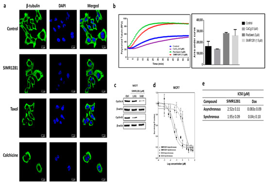 SIMR1281 stabilizes microtubule polymerization. (a) Immunofluorescence analysis of tubulin polymerization in A549 cell line after 24 h of treatment with the IC50 concentration of SIMR1281, taxol, and colchicine (scale bar 5 µm). (b) Tubulin polymerization kinetic effect of the treatment with the IC50 concentration of SIMR1281. (c) Western blot analysis of cyclins A and B expression levels following treatment with SIMR1281 in MCF7 cells. (d) Dose-dependent effect and IC50 values of SIMR1281 and doxorubicin treatment in asynchronous and synchronous MCF7 cells. (e) The IC50 of SIMR1281 in asynchronous and synchronous MCF7 cells. Data; mean ± SEM (n = 3). Full Western blots are available in Figure S9.