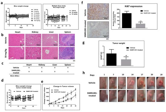 To determine whether the SIMR1281 anticancer phenotype manifests in vivo, a colon xenograft in mice was established. The HCT116 xenograft mice model was treated with 50 mg/kg of SIMR1281 for 30 days. Mice weight and tumor volume were monitored throughout the study. No significant change in mice weight was observed in treated groups compared to the vehicle-treated group (Figure 5d). Tumor volume was measured twice a week using a digital caliper, which revealed a significant reduction in HCT116 xenograft tumor proliferation in SIMR1281-treated groups relative to vehicle-treated groups (Figure 5e,h). At the end of the study, mice were sacrificed, and tumors were collected. A significant reduction in tumor weight was observed (Figure 5g). Additionally, immunohistochemistry analysis was conducted for the detection of the expression of the proliferation marker Ki67. The mean of Ki67-expressing cells from three representative fields per section per sample indicated a significant decrease in Ki67 expression in the 50 mg/kg dose of SIMR1281-treated group (Figure 5f). These findings further confirm the potent effect of SIMR1281 as a novel anticancer modality and provide a concrete corroboration that SIMR1281 effectively disrupts the cancer ecosystem both in vitro and in vivo.