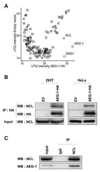 Figure 1. Identification of NCL as a novel AEG-1-interacting protein. (A) The scatter plot shows label free quantification (LFQ) values of proteins identified from AEG-1-HA (X-axis) or empty vector (Y-axis) transfected samples. Perseus software (ver. 1.6.14.0) was employed for visualization. (B) 293T and HeLa cells were transfected with either an empty vector (EV) or the AEG-1-HA expression vector. Immunoprecipitation (IP) was performed using anti-HA antibodies; co-immunoprecipitated NCL was analyzed by western blot. (C) Endogenous NCL was immunoprecipitated in 293T cells and co-immunoprecipitated AEG-1 was analyzed by western blot.