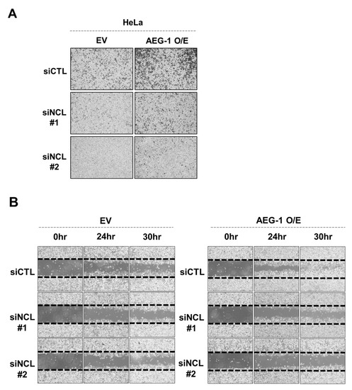 NCL belongs to a family of RNA binding proteins and is important for cell growth and proliferation via multiple mechanisms including ribosome biosynthesis, rRNA transcription, and pre-RNA processing [24]. NCL was originally identified as a nuclear protein, however, additional studies have shown that it is also expressed on the cell surface. This is especially the case in cancer cells, and targeting cell surface NCL has been shown to suppress tumor growth [25,26,27]. Currently, the molecular mechanism by which NCL promotes tumorigenesis is not fully elucidated. Here, we hypothesized that NCL could be important for the oncogenic function of AEG-1. To test this, we examined whether NCL knockdown would impair the cancer metastasis induced by the ectopic expression of AEG-1. The transwell migration and wound-healing assay revealed that the cell migration induced by ectopic AEG-1 expression was significantly impaired when NCL was silenced in HeLa cells (Figure 2A,B). These results suggest that NCL could be a novel mediator of the oncogenic function of AEG-1.