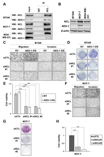 Previous studies have shown that AEG-1 promotes the proliferation, migration, and invasion of cancer cells, and is associated with a poor prognosis in breast cancer [19,20,21,22]. As previously shown in HeLa cells, interactions between the endogenous AEG-1 and NCL were also detected in three breast cancer cell lines (Figure 3A). We examined the expression level of AEG-1 and NCL in a panel of breast cancer cell lines, and observed that both AEG-1 and NCL were highly expressed in MCF-7 compared to other breast cancer cell lines (Figure 3B). Next, we tested whether NCL is important for the tumorigenic function of AEG-1 in breast cancer cells. To that end, we overexpressed AEG-1 in BT549, where AEG-1 expression was shown to be marginal. We found that cell migration, invasion, and proliferation were elevated by AEG-1, and that silencing NCL could abrogate the enhanced cancer cell growth and motility induced by the ectopic expression of AEG-1 (Figure 3C–E). Further, we examined the effect of NCL silencing in breast cancer cells where AEG-1 was already expressed abundantly. We found that cell migration, invasion, and proliferation were impaired by NCL knockdown in MCF-7 cells (Figure 3F–H). These results indicate that NCL plays an important role in AEG-1-mediated tumorigenesis in breast cancer.