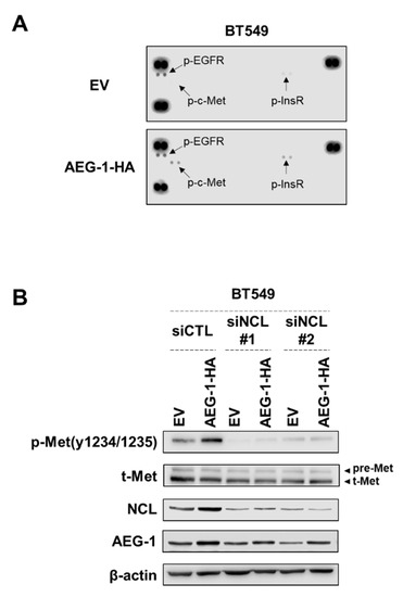 Figure 4. AEG-1 promotes c-Met activating tyrosine phosphorylation and NCL knockdown reduces AEG-1-induced c-Met activation in breast cancer cells. (A) BT549 cells were transfected with the AEG-1-HA or empty vector (EV) plasmids. The global tyrosine phosphorylation of receptor tyrosine kinases was then analyzed by Human Phospho-Receptor Tyrosine Kinase (RTK) Array Kit. (B) BT549 cells were transfected with the indicated siRNAs, then AEG-1-HA or empty vector plasmids were transfected two days later. Cell lysates were subjected to western blotting with the indicated antibodies. Representative data from three independent experiments with similar results are shown. Quantitative analyses are shown in Figure S6. p-Met: phospho-Met, t-Met: total-Met, pre-Met: precursor-Met.