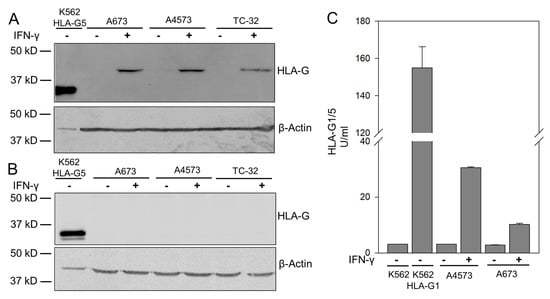 IFN-γ stimulated EwS cells express HLA-G isoform G1. (A,B) Western Blot analysis of HLA-G expression in whole cell lysates of HLA-G5-transduced K562 cells (positive control; a, 1 µg; b, 5 µg) and EwS cell lines A673, A4573 and TC-32, following pretreatment with IFN-γ or untreated (all 50 µg). (A) Anti-HLA-G antibody clone 4H84 (recognizing all isoforms) and (B) Anti-HLA-G antibody clone 5A6G7 (recognizing only isoforms HLA-G5 and G6). (C) Expression of HLA-G in whole cell lysates (25 µg) of wild-type K562 (negative control), HLA-G1 transduced K562 cells (positive control), and EwS cell lines A4573 and A673, following pretreatment with IFN-γ or untreated, using an ELISA exclusively detecting the isoforms HLA-G1 and G5.