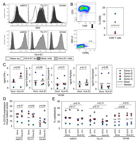 HLA-G1 expressed by EwS cells does not impair antigen-induced cytokine release or cytolysis by CAR gene-modified effector T cells. (A) HLA-G1 and GD2 expression on the cell surface of the GD2-positive EwS cell lines A4573, TC-71 and VH-64. (B) CD85j (ILT-2) surface expression in GD2-BBζ CART. (C) Secretion of IFN-γ and of perforin, granzymes A and B and granulysin by GD2-BBζ CART, upon antigen-specific activation with HLA-G1- transduced and mock-transduced GD2-positive EwS cells (VH-64). (D) CD107a upregulation by CD85j-expressing GD2.BBζ CAR-transduced T cells from 4 individual healthy donors, in response to coincubation with HLA-G1 transduced GD2-positive EwS cell lines. Mock-transduced EwS cells from the same cell lines (HLA-G1 neg) were used as controls. (E) Cytolysis of HLA-G1-transduced EwS cells from 3 GD2-positive cell lines by GD2.BBζ CAR-transduced T cells from 4 healthy donors, with and without preincubation (30 min) with HLA-G1-specific blocking antibody clone 87G (20 μg/mL) or IgG2a control (E:T Ratio 40:1). Mock-transduced EwS cell lines (HLA-G1-neg) were used as controls.