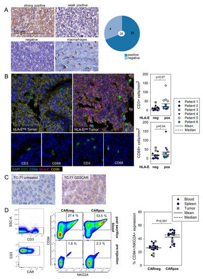 In previous work in EwS, we found that tumor xenografts in response to adoptive therapy with GD2-redirected CAR NK cells or CART strongly upregulate the nonclassical MHC class I molecule HLA-G [6,26]. Moreover, we found that HLA-G is expressed in a relevant proportion of human pre-treatment EwS biopsies either on the tumor cells or on infiltrating lymphocytes and associated with the presence of infiltrating T cells [26]. HLA-E has not yet been studied in EwS.