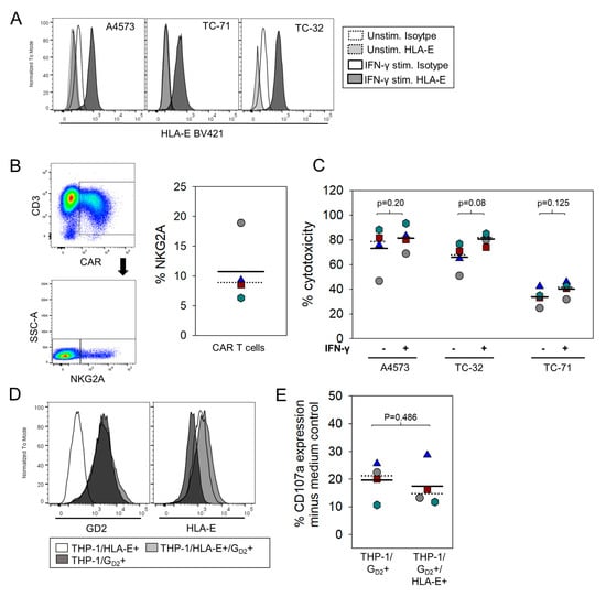 In addition to our previous work [6,26], we provide new evidence for an association of HLA-G and now also HLA-E expression with EwS: Immunohistochemistry analysis of pretherapeutic tumor biopsies detected HLA-E at variable densities in 85% of 26 EwS patients (Figure 4a), compared to 66% of HLA-G positive tumors among 59 EwS patients in a previous report [26]. Comparable to HLA-G, HLA-E can be expressed on tumor cells, stroma cells or both. Both molecules are upregulated under inflammatory conditions in this cancer, mimicked by IFN-γ stimulation in vitro (Figure 1 and Figure 5a) and by treatment of xenograft tumors with GD2-specific CART in vivo [6,26] (Figure 4c). Thus, HLA-G and HLA-E are consistent features of EwS and are responsive to inflammatory stimuli in this cancer. Considering their immune-inhibitory properties, these molecules constitute a theoretical challenge for the optimal activity of tumor-antigen specific CART.