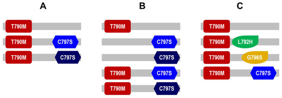 Schematic representation of EGFR and PIK3CA allelic variants in plasma samples of select patients after osimertinib second line treatment. (A) Three distinct alleles: T790M, T790M + C797S (c.2389T > A,) T790M + (C797S c.2390 G > C) (B) Five distinct alleles: T790M, C797S (c.2389T > A), C797S (c.2390 G > C), T790M + C797S (c.2389T > A), T790M + C797S (c.2390 G > C) (C) Four distinct alleles: T790M, T790M + PIK3CA (L792H), T790M + PIK3CA (G796S), T790M + C797S (c.2389T > A).