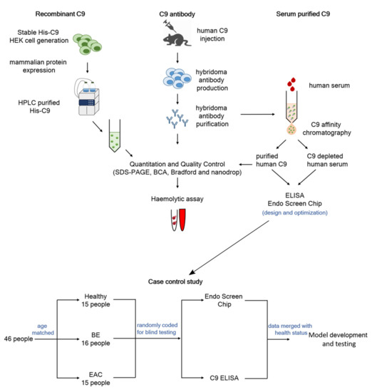 Study overview. High quality reagents including recombinant C9, C9 antibody and serum purified C9 were generated and used to develop C9 ELISA and EndoScreen Chip. The newly established assays were evaluated in a case-control cohort. Logistic regression was used to develop diagnostic algorithms for predicting BE or EAC, by combining blood markers with risk factors.