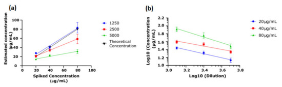 To inform on starting parameters for JAC-C9 lectin immunoassay, we first evaluate the performance of m26 3C9 in a direct ELISA. The accuracy, repeatability, linearity and range were calculated according to the US Food and Drug Administration Q2 (R1) Validation Guidelines [33], using recombinant His-C9 in the standard curve. Firstly, the optimal serum dilution for measurement accuracy was determined using purified C9 spiked into C9-depleted serum at three concentrations (20 µg/mL, 40 µg/mL and 80 µg/mL). As shown in Figure 2a, at a serum dilution of 1/1250, the ELISA accurately measured the concentration of C9 in the spiked sample; however, at higher dilutions, the ELISA underestimated the concentration of the spiked serum. Therefore, serum dilution was fixed at 1/1250. Repeatability was calculated following recommendations by Andreasson and colleagues [34]; the co-efficient of variation (CV) was 3.8%, 5.6% and 4.3% for 20 µg/mL, 40 µg/mL and 80 µg/mL, respectively (n = 5). Linearity was used to demonstrate that the result obtained was directly proportional to the concentration. Given the accuracy of the 1/1250 dilution, it was clear that the result obtained was directly proportional to the concentration (Figure 2a); however, linearity was also assessed for the remaining concentrations (Figure 2b) [34]. Despite the noted underestimate of concentration at high serum dilutions, the concentration determined was still proportional to the actual concentration. Furthermore, since the His-C9 standard was used in combination with spiked serum purified C9, these experiments demonstrate that recombinant His-C9 is a suitable alternative to serum purified C9 for use as an assay standard.