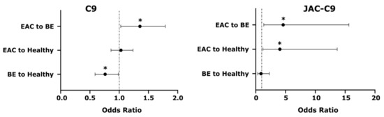 While the above models included both JAC-C9 and C9, we were interested to know if the two markers independently contribute to the predictive model. As JAC-C9 is a glycoform (subset) of total C9, it was possible that the two measures provided similar information. Interestingly, a paired samples correlation between C9 and JAC-C9 showed that these two variables are not significantly correlated in this dataset (r = 0.119, p = 0.432, n = 46). Therefore, we further investigated the contribution of individual markers using odds ratios and Wald statistic for pairs of health conditions (Figure 6). Both C9 and JAC-C9 contributed significantly to the distinction between EAC and BE, but JAC-C9 had a much higher odds ratio (OR = 4.6; 95% CI: 1.6–15.6; Wald statistic, p = 0.014) compared to total C9 (OR = 1.4; 95% CI: 1.0–1.8; Wald statistic, p = 0.032). Furthermore, JAC-C9, but not total C9, contributed to the prediction of EAC relative to Healthy (OR = 4.1; 95% CI: 1.2–13.7; Wald statistic, p = 0.024). On the other hand, total C9, but not JAC-C9, contributed to the prediction of BE relative to Healthy (Wald statistic, p = 0.039), albeit with a modest odds ratio (OR = 0.8; 95% CI: 0.6–1.0). The different diagnostic properties of JAC-C9 and total C9 validate our initial glycoproteomics approach and the development of a glycoform specific JAC-C9 assay.