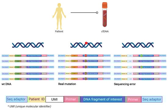 Preparation of sequencing libraries using ID barcodes and unique molecular identifiers (UMI). After the area of interest is selected, the ID barcodes specific to each patient are added to enable to analyze multiple patients in the same assay. After that, UMIs are added to each molecule during library preparation so that sequencing reads originating from the same starting molecule of each patient included in the library can be identified. This approach increases the assay sensitivity in terms of detecting sequencing errors. In the right sequence corresponding to the blue UMI, the alteration is objectified in only 2 of the amplifications, so it is assumed a sequencing error. In the middle sequence corresponding to the orange UMI, the mutation is found in all the amplifications so it is assumed a real mutation. In the left sequence, there is no mutation founded in any of the reads, so it is a wt ctDNA molecule. cfDNA: cell free DNA; wt: wild type; ID: identification; * UMI: unique molecular identifier.