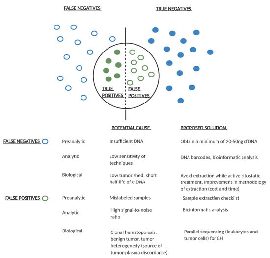 Potential causes of false positive and false negative results in ctDNA analysis and proposed solutions. Empty dots represent false positive/negative results and filled dots represent true positive/negative ctDNA results. For each pre-analytical, analytical, or biological potential false positive/negative result, a possible solution is proposed. Ng: nanograms; cfDNA: cell free DNA; CH: clonal hematopoiesis.